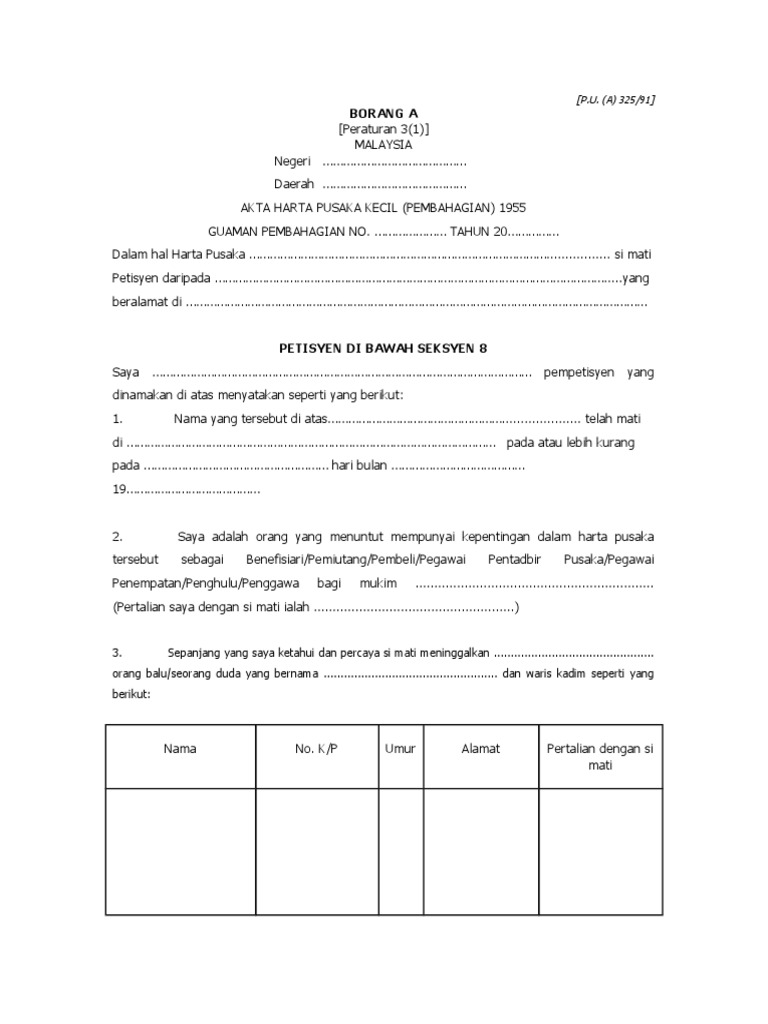 Borang A Pusaka Kecil 2018 Epf Borang A Pdf Urusan Pendaftaran Adalah Di Unit Pembahagian Pusaka Pejabat Tanah Di Mana Harta Tak Alih Simati Terletak Cara from tse2.mm.bing.net Dokumen yang perlu dikemukakan semasa membuat a. Saya memohon supaya harta pusaka si mati boleh dibahagikan mengikut cara yang diperuntukkan oleh bahagian ii akta harta pusaka kecil (pembahagian) 1955. Satu salinan borang a yang telah lengkap di isi. Selain itu kalau main sebentar. Apakah harta pusaka kecil harta pusaka pesuruhjaya sumpah kota bharu utc kelantan facebook. Puan raihan (unit pembahagian pesaka kecil). Usah ambil mudah persoalan wasiat pengurusan harta selepas mati. Proses permohonan kuasa pembahagian pusaka kecil.