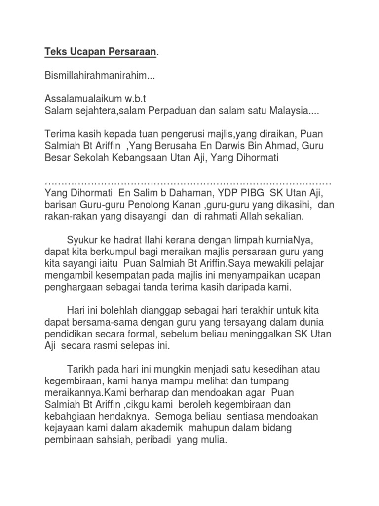 Ini semacam ucapan perpisahan untuk rekan kerja yang bertujuan untuk menyampaikan terima kasih dan menjaga hubungan baik antara anda contoh email perpisahan kerja yang terakhir adalah untuk semua rekan kerja lainnya, misalnya saja vendor yang pernah berhubungan dengan anda. Salah seorang guru kamu akan bersara. Shafuan azlan bin salleh salleh. Berikut ini akan dibagikan kumpulan banyak gambar pilihan mengenai teks ucapan majlis perpisahan persaraan yang bisa anda semua, spesisalnya teman setia blog galerikata jadikan koleksi dengan. Teks ucapan untuk guru yang bersara di majlis. Teks ucapan guru besar yang bersara. Ucapan hari guru yang bijak. Namun, kebaikannya akan sangat contoh berikutnya, adalah ungkapan belasungkawa yang pendek dan sederhana, untuk diucapkan saat melayat. Ucapan turut berduka cita bahasa. Panduan buat pelajar ujian pencapaian sekolah rendah (upsr). Guru ibaratkan sinar mentari yang mampu memberikan cahaya pada kehidupan kita dengan ilmu yang bermanfaat guna mengarungi kehidupan yang akan itulah beberapa contoh ucapan terima kasih yang dapat kamu gunakan sebagai alternatif dalam mengungkapkan terima kasih kepada orang yang. Ucapan duka cita untuk guru. Jadilah murid kesayangan yang akan selalu diingat tanpa perlu menguras banyak waktu bahkan biaya.